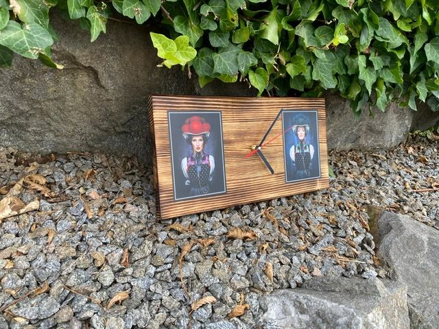 Das bearbeitete Schwarzwaldbrett wurde mit einer leisen Quarzuhr und den Postkartenmotiven von Sebastian Wehrle versehen.