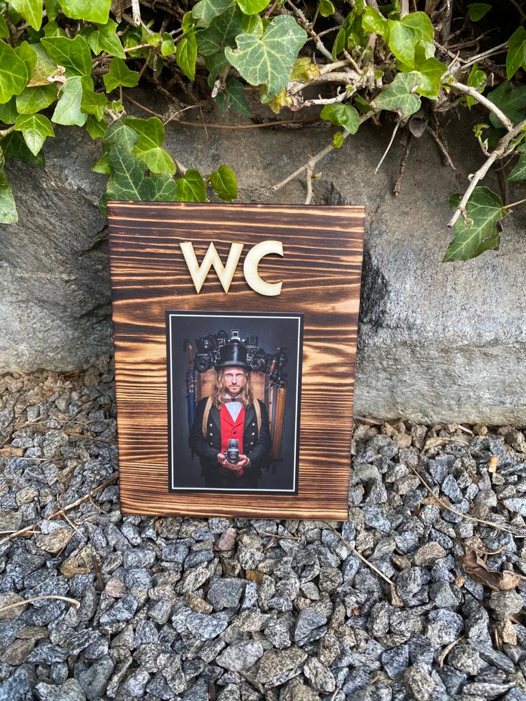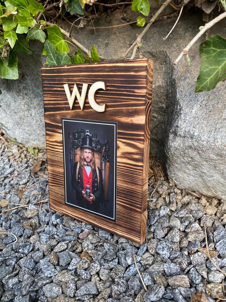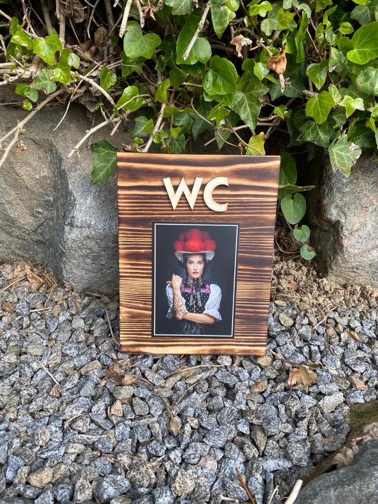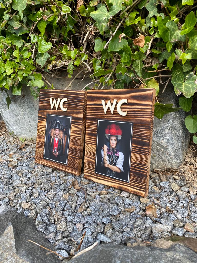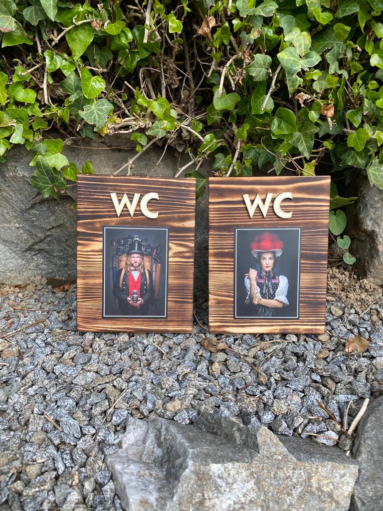 Zwei stylische Holzbretter im Schwarzwaldflair mit WC Kennzeichnung.